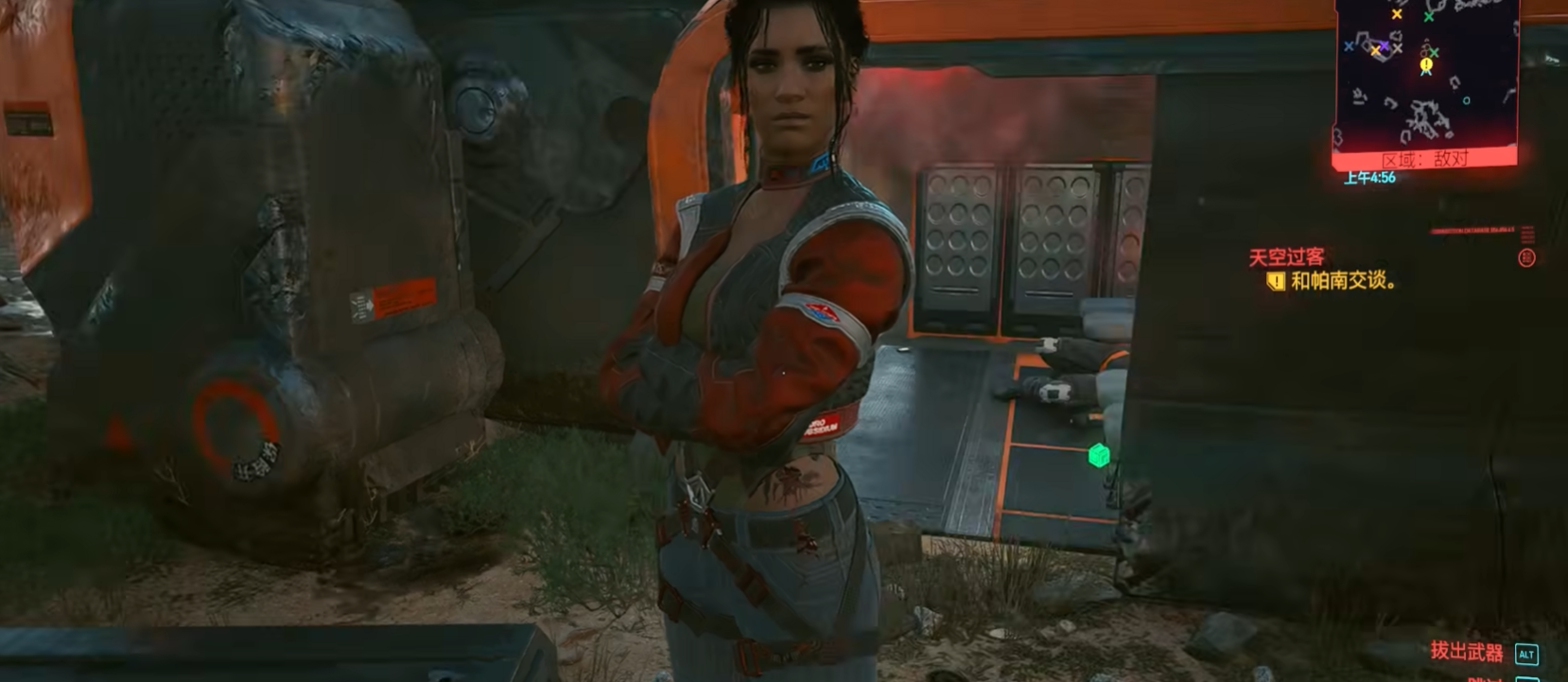 朱迪·阿尔瓦雷兹是技术专家,擅长改装电子设备,只有女性主角可以与其发展恋爱关系。她的支线任务链金字塔之歌是触发浪漫情节的关键,需要在对话中始终支持她的决定,并在潜水任务后选择亲密选项。帕南·帕尔默是流浪者家族的成员,仅限男性主角攻略,她的支线任务涉及夺车和袭击康陶公司,在酒吧喝酒时需选择特定对话选项才能推进关系。