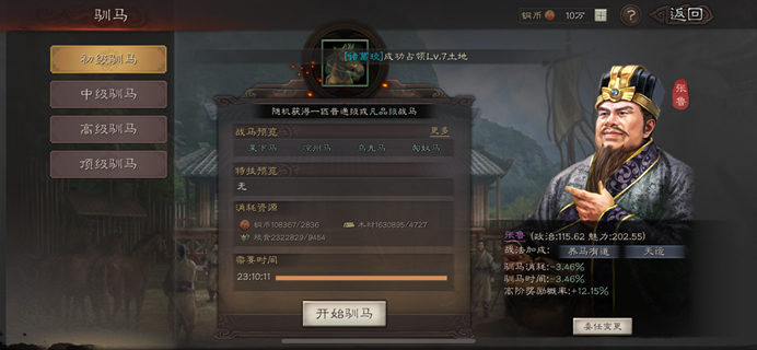 驯马需要消耗铜币、木材和粮食,尤其是高级驯马,消耗的资源更多。平时记得多屯田和打资源地,确保驯马时资源充足。驯马场的数量也很关键,尽量多建几个驯马场,这样可以同时训练多匹马,提高效率。驯马场升级需要大量资源,建议先集中资源升一个高级驯马场,再慢慢扩展。