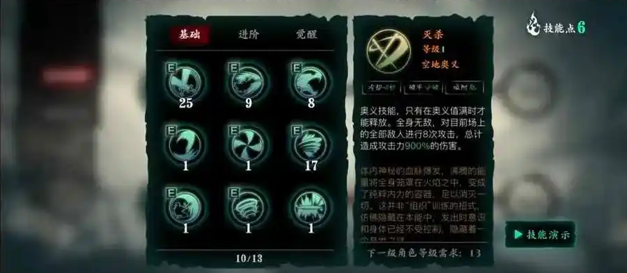 葵作为高爆发输出角色,其技能加点需围绕核心输出与生存能力展开。优先将技能点分配给主要输出技能月影和月华,这两个技能是葵的核心伤害来源,提升至满级可显著增强战斗效率。月影具备快速突进与高额伤害特性,适合先手贴近敌人;月华则兼具反击与闪避功能,是应对敌方攻势的关键手段。云麓作为打断技能可适当投入点数,但无需满级,只需保证基础功能性即可。