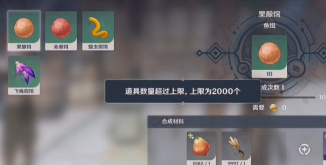 制作鱼饵需要找到合成台,在界面里选择鱼饵合成标签页。荧草饵是万能饵料,能吸引所有鱼类,但需要完成鲸井椛的鱼群大爆发任务才能解锁配方。飞蝇假饵和蠕虫假饵则针对假龙类、炮鲀类等大型鱼,材料需要绯樱绣球、马尾或史莱姆凝液。建议提前囤积这些材料,尤其是树莓和禽肉,平时探索时多采集就不会临时手忙脚乱。