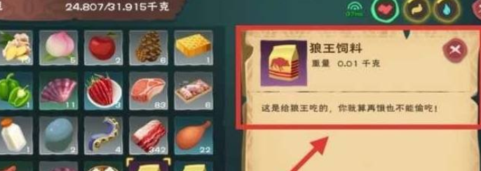 狼王饲料的配方为土豆饲料包、生羊排和优质肉,通常需要准备13-15包以确保捕捉成功率。饲料材料可通过击杀绵羊或大型生物获取羊排与优质肉,土豆则需提前采集。制作时需使用烹饪台将材料组合,建议批量烹饪以提高效率。捕捉流程需先用木棒将狼王血量削弱至30%左右并击晕,随后连续投喂饲料直至爱心图标填满,最后使用捕捉器完成驯服。