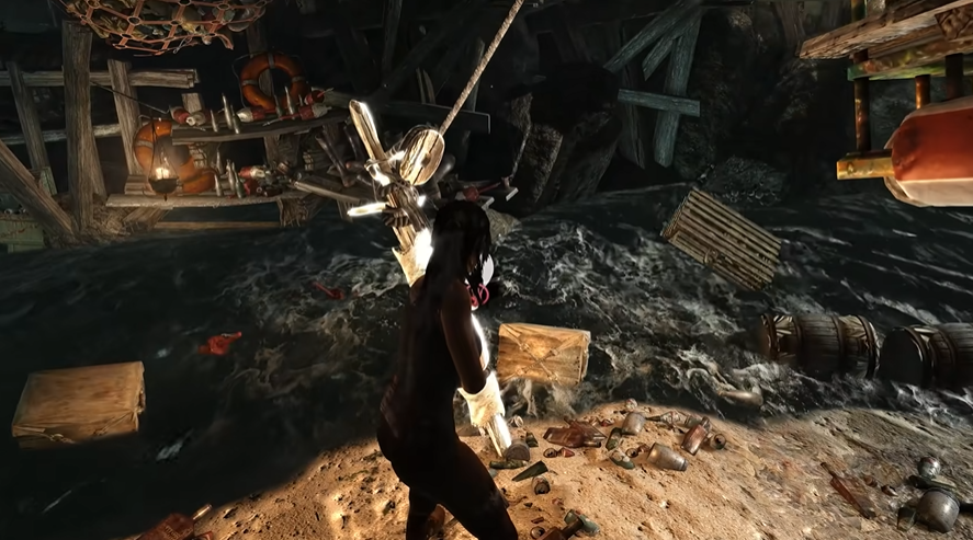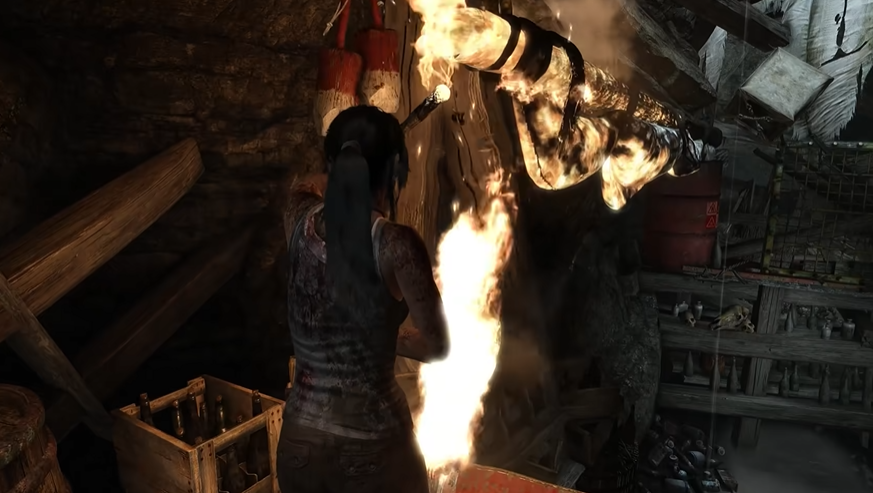 拿到火把后往前走会遇到第一个障碍物,按住互动键就能烧掉挡路的货物。这里要注意保持火把持续燃烧,路过火盆时可以重新点燃。接着会遇到敌人抓住你的脚,快速左右晃动摇杆就能挣脱。逃命过程中记得多观察环境,有些木架可以攀爬,看到发亮的布条就烧掉它,这样能引爆油桶炸开新通道。水里游泳时要小心氧气条,找到拴住水闸的木棒烧断就能打开新区域。