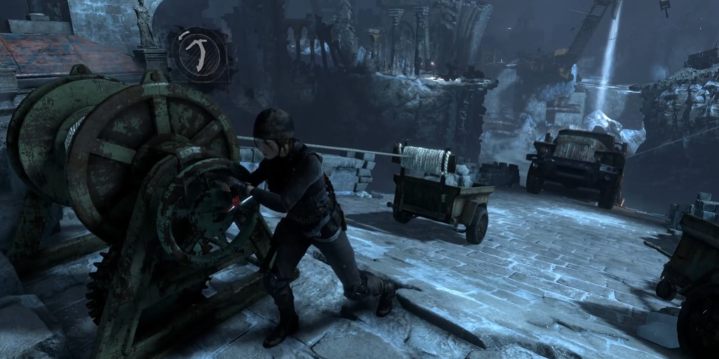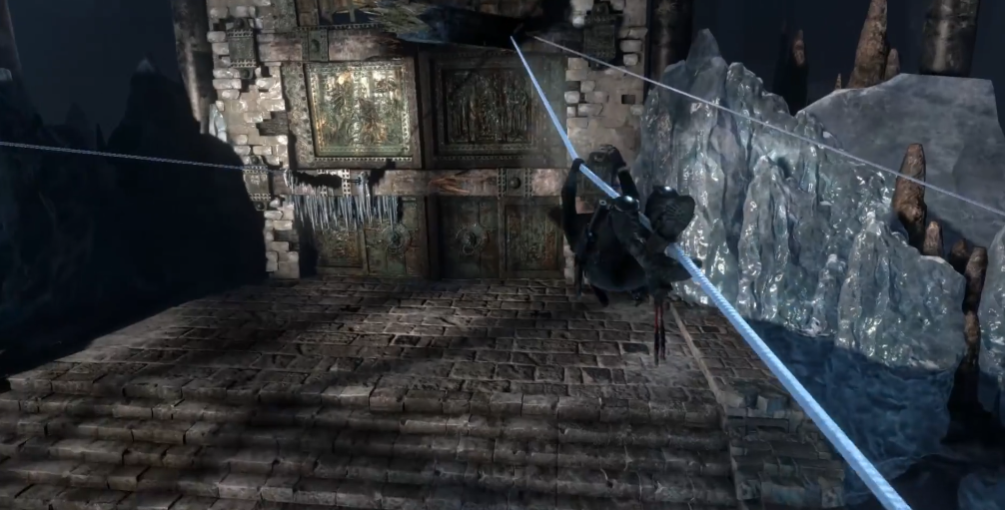 第二阶段需沿冰块路径攀爬至桥体顶部,通过转轴机关与水桶联动解谜。将箭矢射向空中悬挂的水桶并转动转轴注水,利用水桶重量下拉机关彻底打开大门。过程中需注意时间控制,水桶注满后需迅速跑向门缝,跳跃至对面平台完成突破。若操作失误导致水桶回落,需重新触发转轴机制。