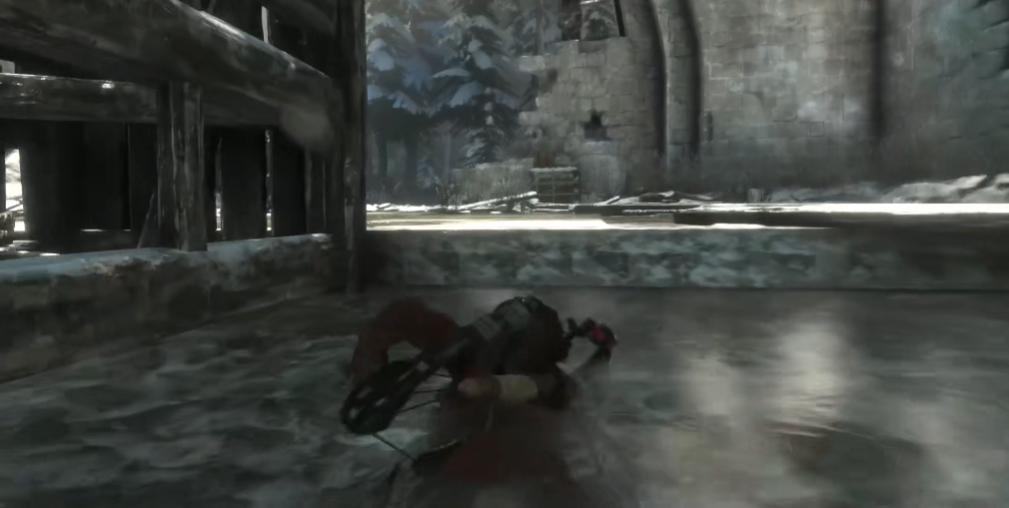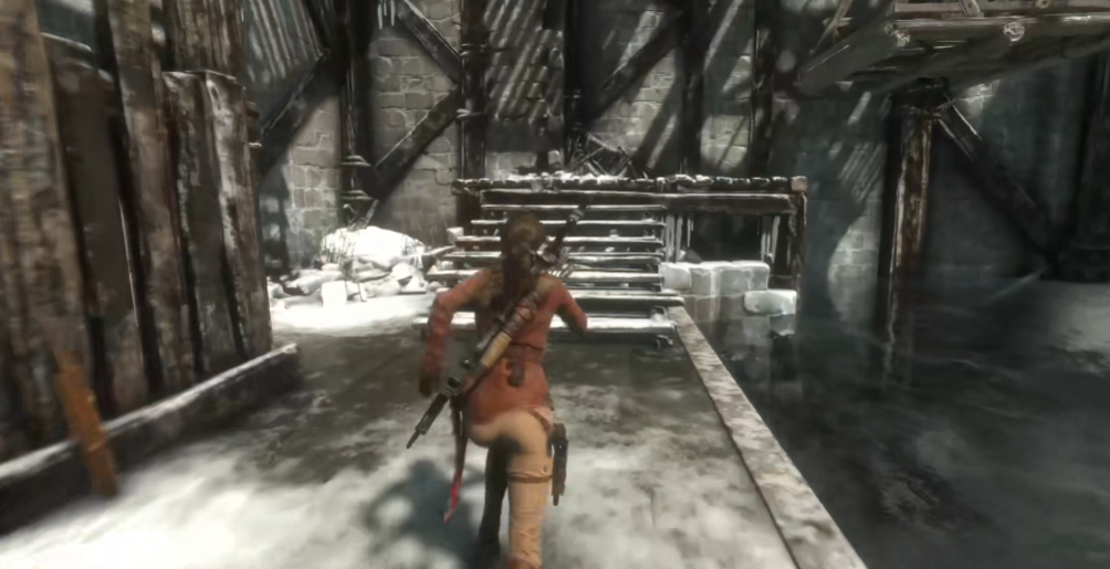 完成平台固定后,需攀爬至右侧高台。从固定好的右侧平台起跳,借助二段跳或抓取动作到达第二层平台。在第二层平台会发现另一个转轮,需用绳箭将其与远处转轮相连。需注意时间控制,因为绳箭连接的平台仅有约13秒的有效时间。操作完成后需立即返回一层转轮处,通过中间木板或左侧楼梯攀爬至绳箭连接的绳索上,避免因时间不足坠落。