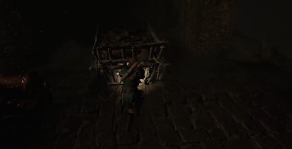进入圣科尔多瓦古墓挑战区域后,会看到一条堆满尸骨的水道,游进去会被暗流卷到一个水潭里。穿过洞穴来到遗迹入口,跳下去后右侧有个坍塌神庙大本营。从大本营左侧进入通道,穿过窄缝来到一间石室,这里通道被堵住了,需要把移动炮台推下斜坡撞开入口。进去后会发现一艘大木船,船上有横杆和桅杆,咱们需要调整它们的位置来解开谜题。