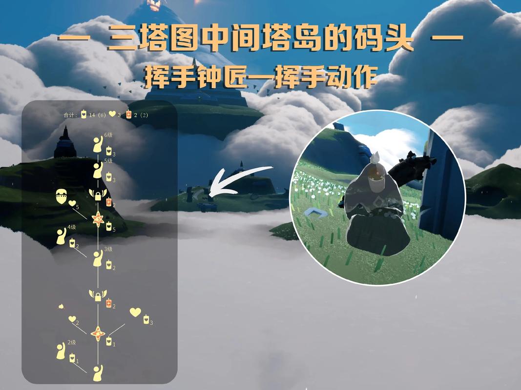 接下来还有几位先祖位置稍微隐蔽些,在入口处右边那座塔的下方,有一个山洞,飞进去就能找到第五位先祖,它通常会给你带来欢乐的动作,至于第六位鸟叫先祖,则需要你回到蝴蝶平原,往右边的浮岛图飞,那里有一个隐藏区域的入口,需要你先解锁一定数量的先祖才能打开传送门,进入那片浮岛地图后,一直飞到最里面的一座小岛上,就能发现这位发出悦耳鸣叫的先祖了,它的声音能帮你更好地定位。