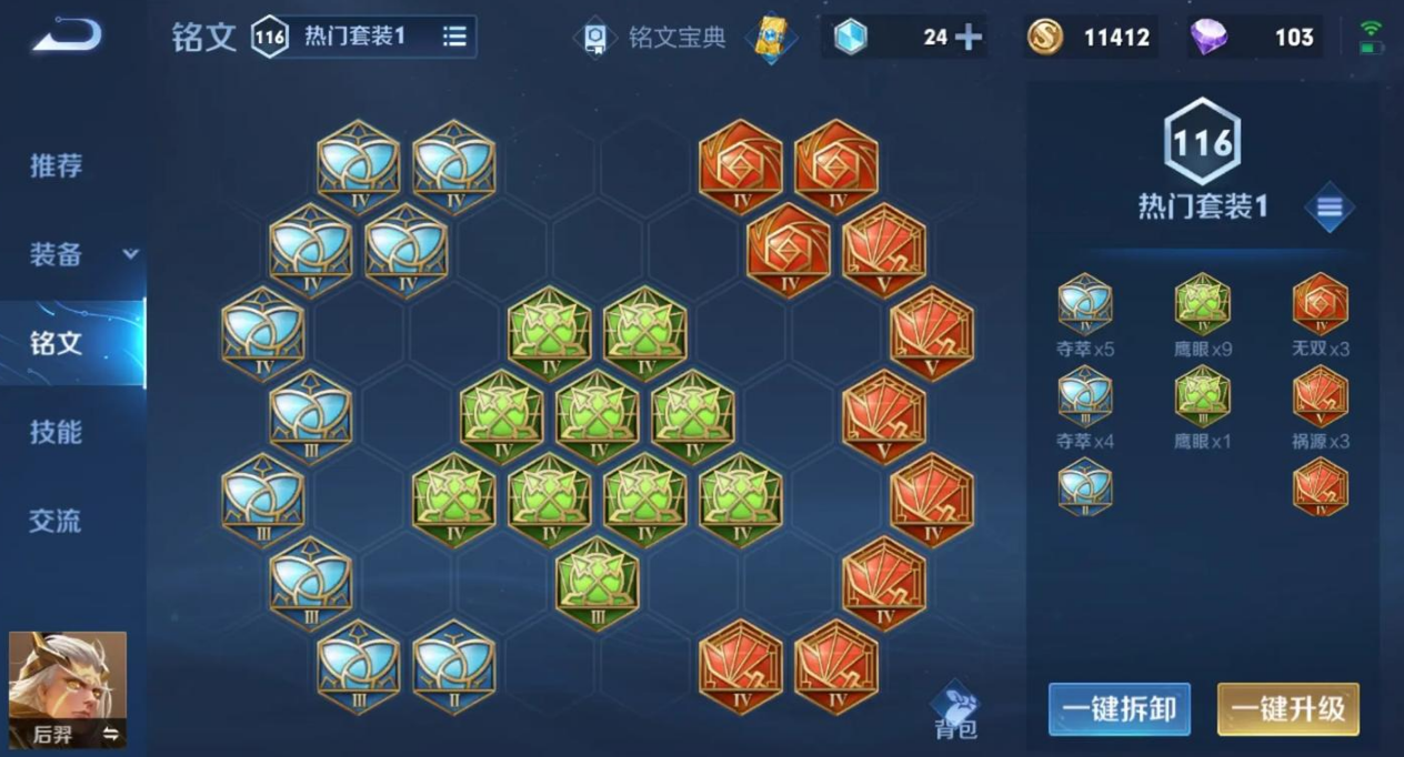 后羿作为持续输出型射手,铭文和出装的核心思路就是堆攻速和暴击,让普攻输出拉满。他的被动技能让攻速叠加后普攻变成三支箭,所以攻速越快伤害越爆炸。铭文方面推荐红色带祸源或者红月,增加暴击率和攻速;绿色必选鹰眼提供物理穿透;蓝色可以搭配夺萃和狩猎,既能吸血赖线又能提升移速。这套铭文让后羿前期对线不虚,清兵快还能靠吸血续航,中期装备成型后团战输出直接拉满。