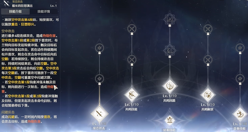 技能升级上优先点满船长的普攻和回路,因为这些技能直接影响主要输出方式,大招可以适当升级但不必作为首要目标。操作时船长通过空中普攻积累能量,落地后释放共鸣技能和声骸技能,以最大化伤害输出,熟悉这种节奏能让玩家更好地驾驭战斗风格。空中普攻四下后落地直接释放强化技能,能有效打满能量条并触发额外效果。