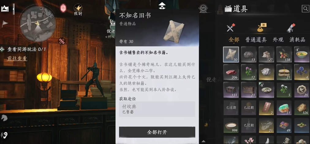 除了不知名的旧书,付坟典同时也出售名为一流神功秘笈的物品。相较于作为剑气纵横核心获取途径的旧书,该秘笈的具体用途与效果在相关说明中提及较少。玩家在购买不知名的旧书时由于残页产出存在概率性,通常需要多次购买才能集齐合成完整心法所需的十张残页,这是一个需要投入相应游戏货币的过程。购买后,旧书会存放在玩家的包裹任务栏中,需要手动打开以获取其中的残页。