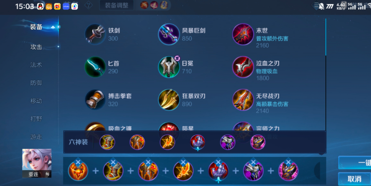 说完了铭文,接下来就是出装的重头戏了。根据不同的对局情况和你的打法喜好,亚连主要有两种出装思路,一种是偏肉的暴击流,另一种是偏输出的疾刀流。暴击流出装顺序通常是:抵抗之靴、影刃、无尽战刃、血魔之怒、暴烈之甲,最后一件看情况补永夜守护或者纯净苍穹。这套出装的思路很明确,抵抗鞋减少被控时间,影刃提供巨额的攻速和暴击率,完美契合亚连的攻速转攻击力被动,无尽战刃把暴击伤害拉到极致。后面几件装备血魔之怒、暴烈之甲则提供了可观的生命值、护盾和伤害加成,让亚连在拥有高暴击输出的同时,身板也变得很硬,能抗能打。这套装备成型后,切后排能力非常强,而且不容易被秒杀。