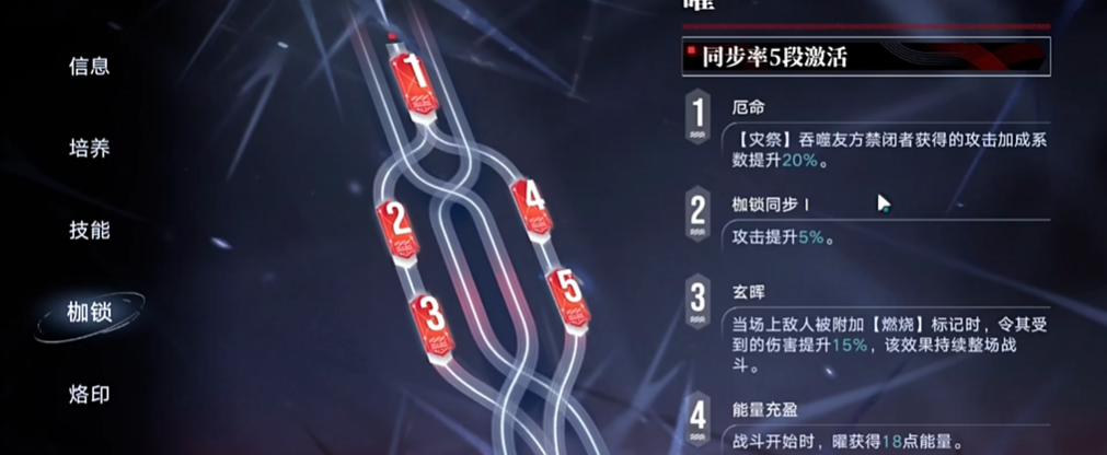 曜是一名狂级狂暴系禁闭者,她擅长法术输出,技能组合围绕高额伤害与状态切换展开。其普攻焰斩能进行多段攻击,每段造成自身攻击一定比例的法术伤害。必杀技能分为灾祭和坠日两种形态,灾祭会吞噬除自身外一个指定友方禁闭者,使曜进入二刀形态,缩短普通攻击间隔并提升攻击力,同时将必杀切换为坠日,持续一定时间;坠日则能直接充盈能量,对身前九宫格范围内敌人造成多段斩击,总伤害可达自身攻击的较高倍率,并且对核心被击破的敌人造成额外提升的伤害。被动技能金乌之炎可为攻击附加燃烧标记,造成持续法术伤害,另一被动照临万物则进一步增强她的战斗适应性。