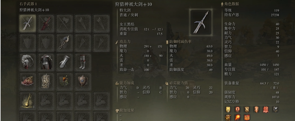亵渎圣剑被誉为该流派的核心毕业武器之一,它拥有出色的力信补正,其战技不仅能造成高额火焰伤害,还附带击杀敌人后回复血量的特效,推图和对抗BOSS都非常实用。在获得亵渎圣剑前,狩猎神祇大剑、黄金戟或厚重质变的巨剑都是优秀的过渡选择。盾牌方面,一面防御强度高的中盾如黄铜盾至关重要,将其强化并搭配铁壁盾防战灰后,可以实现对大多数物理攻击的完美防御。祷告为力信战士提供了强大的辅助和伤害补充。