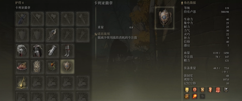 增益类祷告如黄金树恩惠能持续恢复生命,黄金树立誓可以提升攻防能力,雷电护体则能增加自身韧性。伤害类祷告中,黑焰球拥有按比例扣血的特性,对付高血量敌人效果显著;精准雷击施放速度快,适合应对中距离的敌人或补刀。在实战中,进入战场前为自己叠加多种增益祷告,看到角色身上环绕多种光芒时,生存和输出能力都会获得巨大提升。大壶护符可以显著提升负重上限,让你能穿戴更厚重的铠甲。群聚信徒的立誓布能增强祷告的威力。古王护符则可以延长你施加的增益效果持续时间。最后一个护符槽位可以根据需求灵活选择,例如卡利亚徽章用于减少战技的专注值消耗,或者祖灵角在战技命中后回复蓝量。