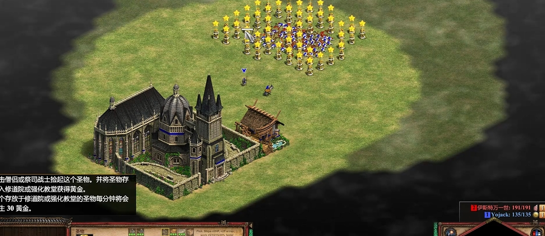 圣物是地图上随机分布的金色方形立碑或白色小物件,它们看起来不起眼,但作用非常大。你需要派僧侣去捡起来带回修道院,每个圣物放进修道院后,每秒钟都会自动产生黄金。圣物捡得越多,黄金涨得越快,特别是在游戏后期资源紧张时,这些黄金能帮你维持军队和科技升级。如果胜利条件选的是标准模式,集齐所有圣物并保护修道院200年不被打掉,就能直接获胜。