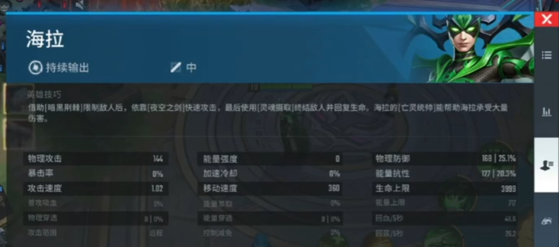 海拉作为漫威超级战争中的冥界女神,其技能机制围绕死亡能量展开,通过普攻叠加印记与能量造成爆发伤害。被动技能死亡女神使普攻命中敌人时附加死亡能量,目标脱战后会受到基于死亡能量50%的伤害,若击杀目标则回复自身生命值。该被动配合冷却缩减装备可额外提升攻速,这是海拉持续输出的核心保障。