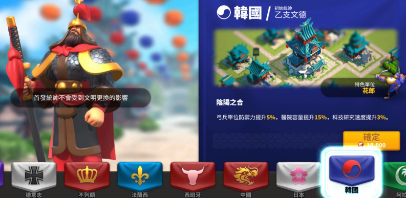 对于新手来说,中国文明是公认的万金油开局。它的建筑加速效果能帮你快速提升市政厅等级,缩短发育周期,而且诸葛弩作为特色单位在前期也有不错的战斗力。如果想走防守路线,韩国文明的科研加速和防御加成能让你安心种田。
