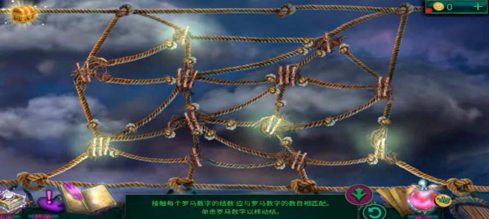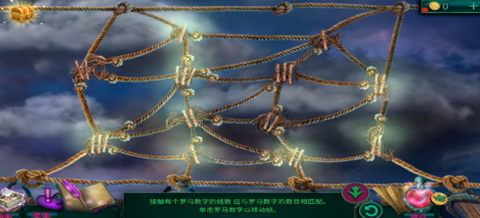 绳结解密的关键在于理解罗马数字与绳结数量的对应关系。每个罗马数字周围的绳结数量必须与该数字本身相匹配,例如罗马数字2周围需要接触2个绳结,数字3则需要3个。初始状态下绳结分布杂乱,需要通过点击罗马数字来调整绳结走向,每次点击会改变相邻绳结的位置。解密过程中需注意观察绳结与数字的实时对应状态,成功匹配的罗马数字会发光提示。