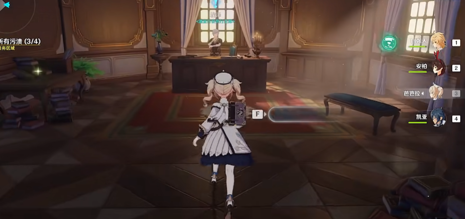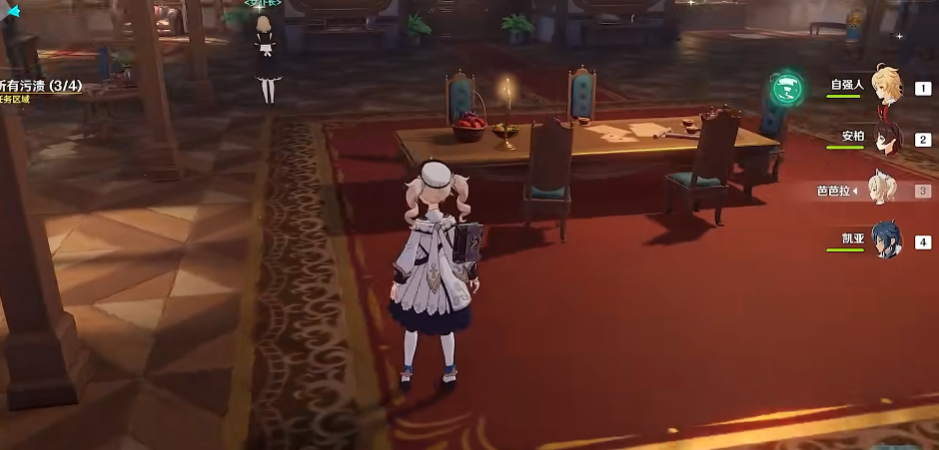 污渍的具体位置包括:进门左手边的会客厅地毯、迪卢克办公桌前方的地毯、沙发附近的地毯以及楼梯旁桌子的后方。风元素角色如主角需释放两次技能才能彻底清除一处污渍,而水元素角色如芭芭拉或行秋只需一次普通攻击或技能即可。建议优先使用水元素角色提高效率,避免反复切换角色耽误时间。