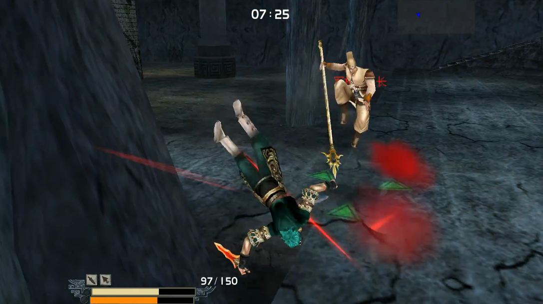击败首个哨兵后,立即拾取其掉落的长枪替换匕首。长枪攻击范围优势明显,更适合应对剩余敌人。随后转向下方通道,优先解决落单的另一名哨兵,过程中需注意走位避免触发石柱倒塌。部分石柱击碎后可获得血量补给,但需预判倒塌方向以防被砸伤。最后应对哨兵长时,可借助高台地形优势,持续用飞镖远程消耗,或利用长枪的突进技能前A进行压制。