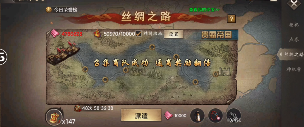 跑珍宝活动时建议预留金币与粮食,避免因资源短缺中断进度。西域锦囊可替代部分金币消耗,但需通过日常任务积累。陨铁、宝石等材料应优先用于强化主力武将的装备与战车,战车等级至少达到2级方可应对高难度副本的护甲机制。
