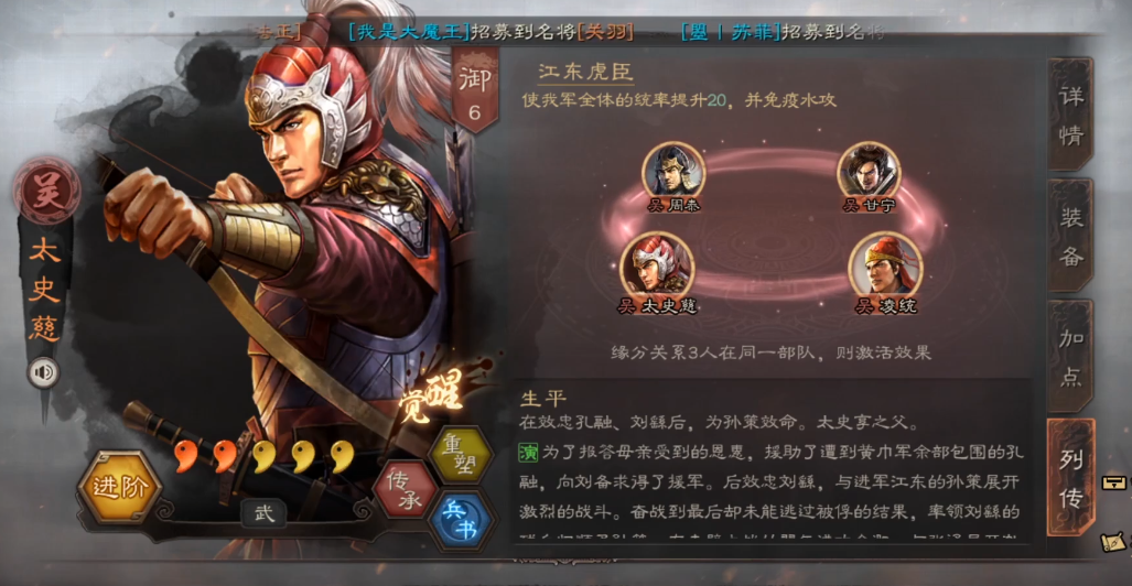 针对肉弓的防御和续航机制选择恰当的克制战法是关键,肉弓依赖减伤和回复战法如暂避其锋与刮骨疗毒来维持持久战,使用当锋摧决可以禁用其指挥和被动类战法直接破坏减伤体系,震慑或计穷类战法如威谋靡亢能打断技能循环优先限制太史慈的连击输出,禁疗战法如绝其汲道或挫锐能削弱回复能力防止拖入消耗战,盛气凌敌对依赖普攻的武将如太史慈有显著限制效果。
