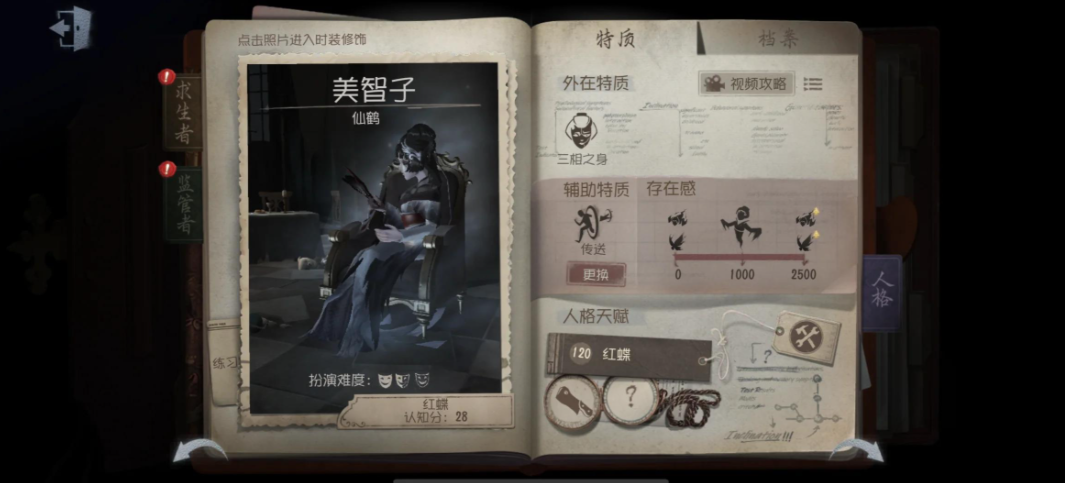 红蝶是一位以高机动性著称的监管者,凭借三相之身技能在美人相、般若相和惊惶相之间切换,适应不同追击场景。美人相下移动速度提升且恐惧范围较小,便于隐匿接近目标;般若相则用于主动攻击和技能释放,但移速较慢;惊惶相在求生者正面注视时触发,会削弱红蝶的追击能力。核心技能刹那生灭能无视地形快速突进,离魂移魄提供空中视野以观察战场,而苦海翩跹通过燕尾蝶标记求生者或辅助位移。玩家需灵活切换形态,避免被中断技能,从而发挥红蝶的瞬移和控场优势。