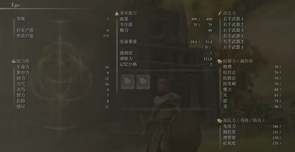 流浪骑士作为新手友好职业,可走纯力量路线,配合100%物防盾稳健推进;观星者等法系职业需优先提升智力至20点,并获取陨石杖等早期强力法器。出血流等特殊流派要求感应属性达到50点,但成型较晚不适合纯开荒。加点时需注意负重上限,力气属性会影响装备选择,过重会导致翻滚性能下降。中后期可根据获取的强力装备调整加点方向。