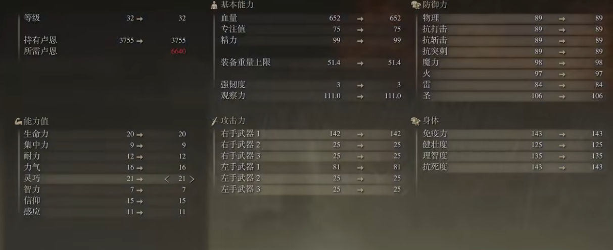 对于新手而言,首要任务是提升生存能力,建议优先将生命值加到15-20点,确保不会被普通敌人两刀击杀。耐力同样关键,需维持在能连续攻击三次并翻滚躲避的水平。力量型职业如流浪骑士可先满足武器需求后主堆血量,法系职业则需兼顾集中力与主属性。初期不建议分散加点,应专注提升核心属性以快速形成战斗力。