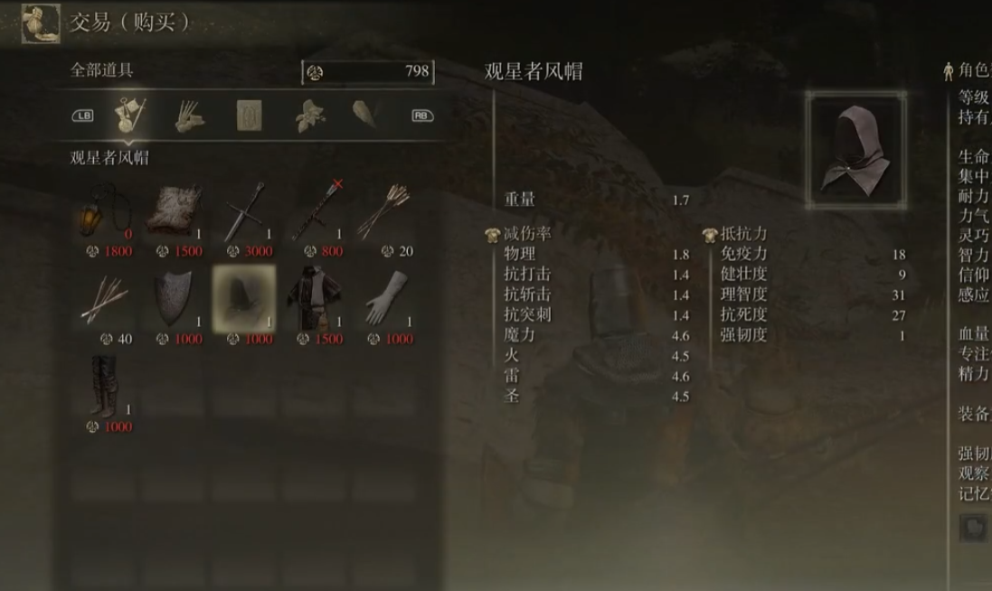 这套装备可以在利耶尼亚湖(湖边)赐福旁的流浪商人处购买,总价格为4500卢恩。虽然这套装备的防御属性较为基础,但作为法师职业的过渡装备,在游戏初期仍有一定实用价值。要获取观星者套装,首先需要传送到利耶尼亚湖区域的湖边赐福点。沿着道路前进会看到一处篝火,旁边坐着流浪民族的商人。与其对话后进入购买界面,在道具栏中找到观星者套装进行购买即可。这套装备并非必须购买,因为选择观星者职业的玩家开局就会自带这套服装,但对于其他职业想尝试法师路线的玩家而言,这是获取该套装的主要途径。